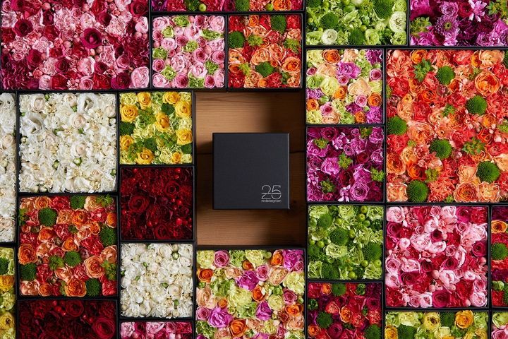 「ローズコレクション フラワーボックス」は、フラワーボックスの25周年を記念して製作されたスペシャルボックスだ。ローズのみで彩られた16種類のデザインで展開。ボックスにはアニバーサリーのロゴが施されている。柔らかなベイビーピンクから情熱的なバーガンディーまで、ローズのカラーグラデーションが美しいデザインで、バレンタインデーホワイトデーにも最適なギフトとなるはずだ。
