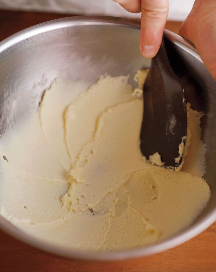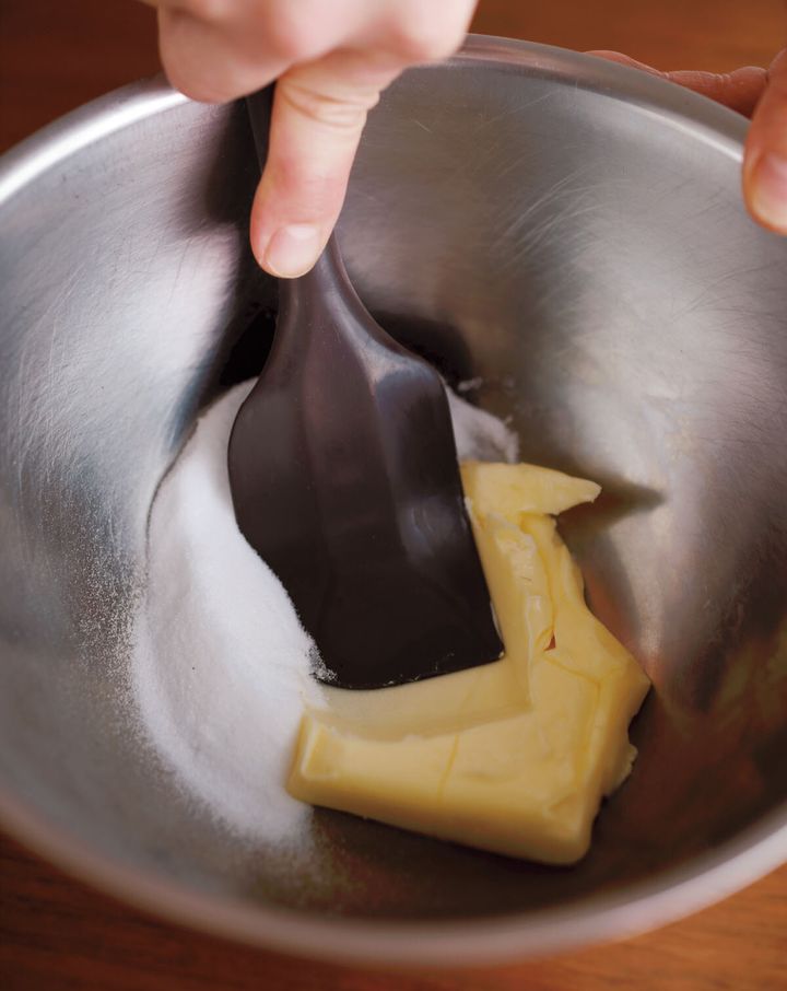 ボールにバター、グラニュー糖、塩を入れ、ゴムべらで練り混ぜる。
