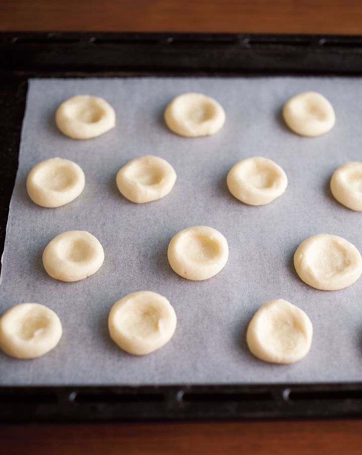 オーブン用シートを敷いた天板に4を間隔を2cmほどあけて並べる。170℃のオーブンで17~20分焼き、天板ごとケーキクーラーにのせて粗熱を取る。
