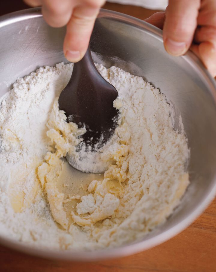 (1)に薄力粉を加え、粉けがなくなるまで混ぜる。