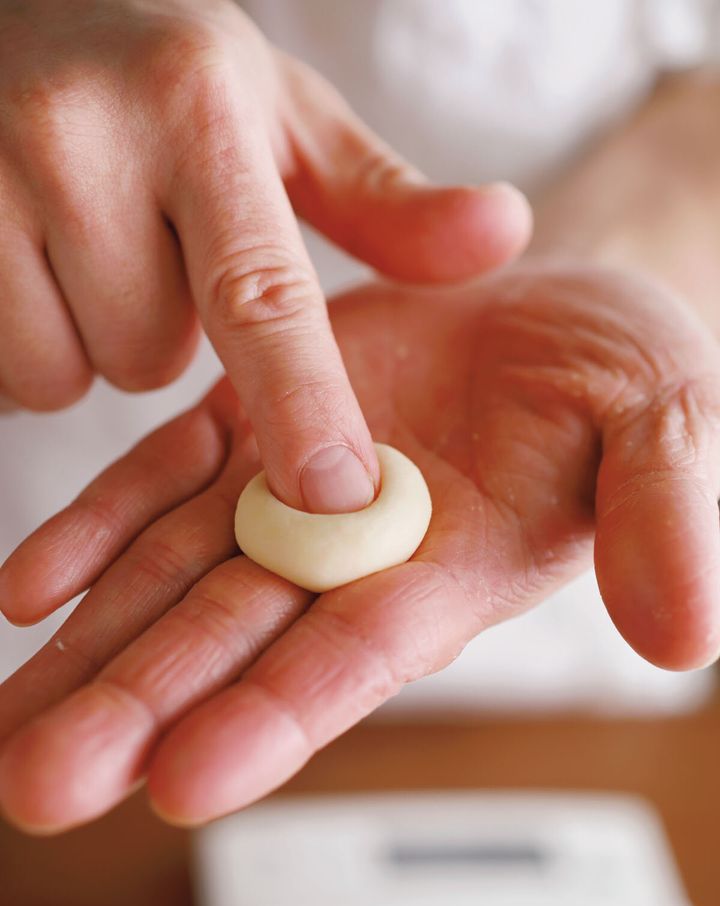 (3)を10gずつ丸め、中央をへこませて直径3cmに成形する。