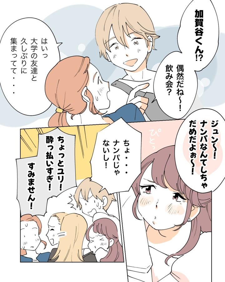 「ジュン~!ナンパなんてしちゃだめだよぉ~!」と女の子の声が。「ちょ・・ナンパじゃないし!」と加賀谷くんが答えると、「ちょっとユリ!酔っ払いすぎ!」と友達らしき女の子が言い、私に向かって「すみません!」と謝ったのでした。