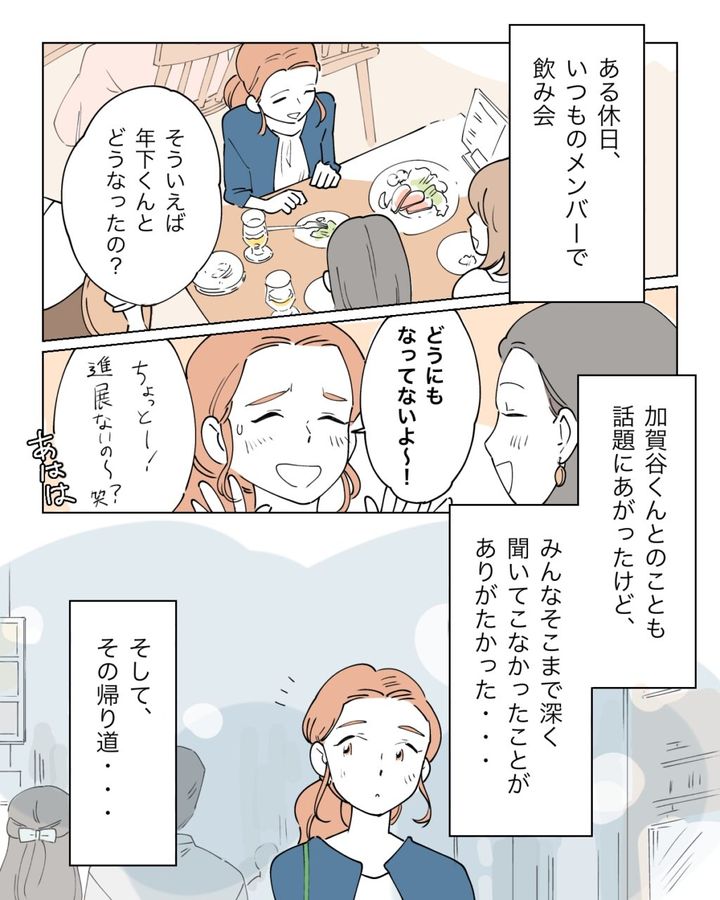 「そういえば、年下くんとどうなったの?」と聞かれ、「どうにもなってないよ~!」と即答。「ちょっとー!進展ないの~?笑」と笑い話に。