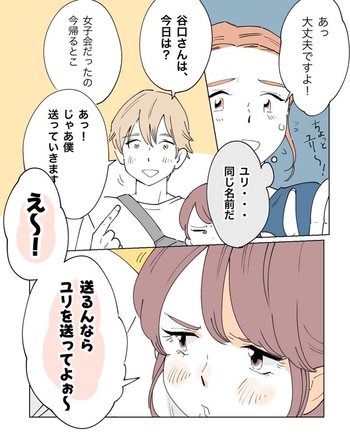 「あっ大丈夫ですよ!」と答えつつ、「ユリ・・同じ名前だ」と思う私に、「谷口さんは、今日は?」加賀谷くんが言いました。「女子会だったの。今帰るとこ」と言うと、「あっ!じゃあ僕送っていきます」という加賀谷くんの声を遮るように、「え~!送るんならユリを送ってよぉ~」と同級生のユリちゃんが言いました。