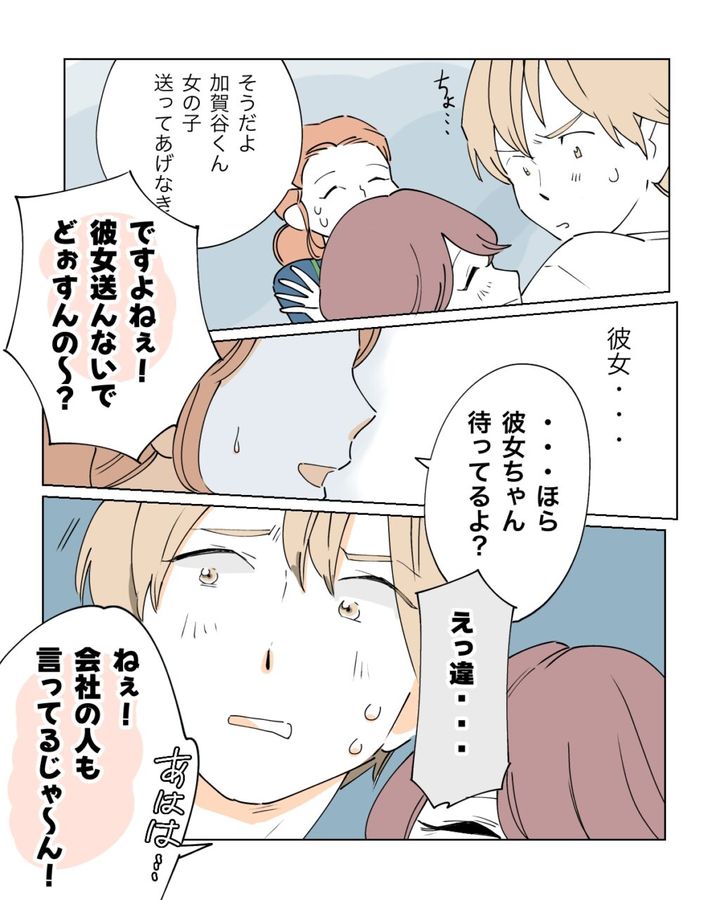 ユリちゃんの言葉を聞いた私は、「そうだよ加賀谷くん。女の子送ってあげなき・・」と言い終わる前に、「ですよねぇ!彼女送んないでどぉすんの~?」と言うユリちゃんの「彼女」という言葉に、「・・ほら彼女ちゃん待ってるよ?」と言いながら少し動揺している私。「えっ違・・」と言いかける加賀谷くんに、「ねぇ!会社の人も言ってるじゃ~ん!」とご機嫌なユリちゃん。