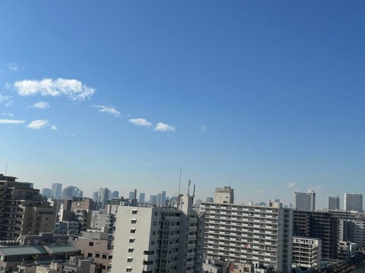 窓からの眺め。空が広い! 都心のビル群も遠くに見えます。
