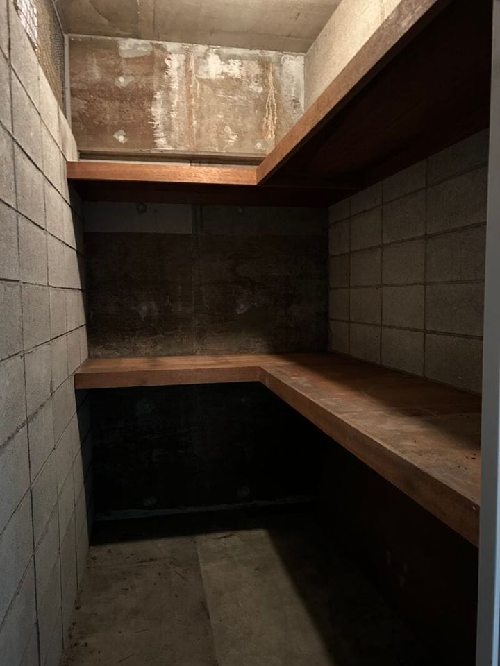 さらに、「この物件はトランクルーム付きです」とのこと。小さな部屋に住み替えるにあたり、気になるのは荷物の収納。1階にある占有のトランクルームを早速見に行きます。セメントブロックで区切られた簡素な空間ですが、棚が2段もついていて、収納力が高そう。何より、ゴルフバッグやバイク用品など荷物の多い夫は「おお~!」とニッコニコ。