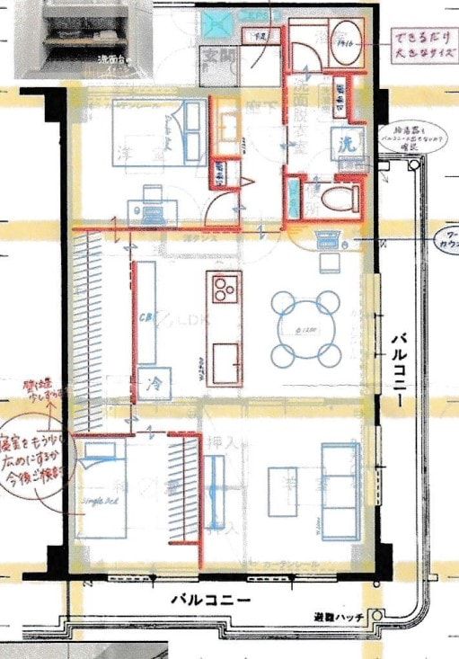 ざっくりですが、2LDKの間取り、アイランドキッチン、壁は塗装にしたい、などの要望を伝え、間取り図ができました。パチパチパチ。
