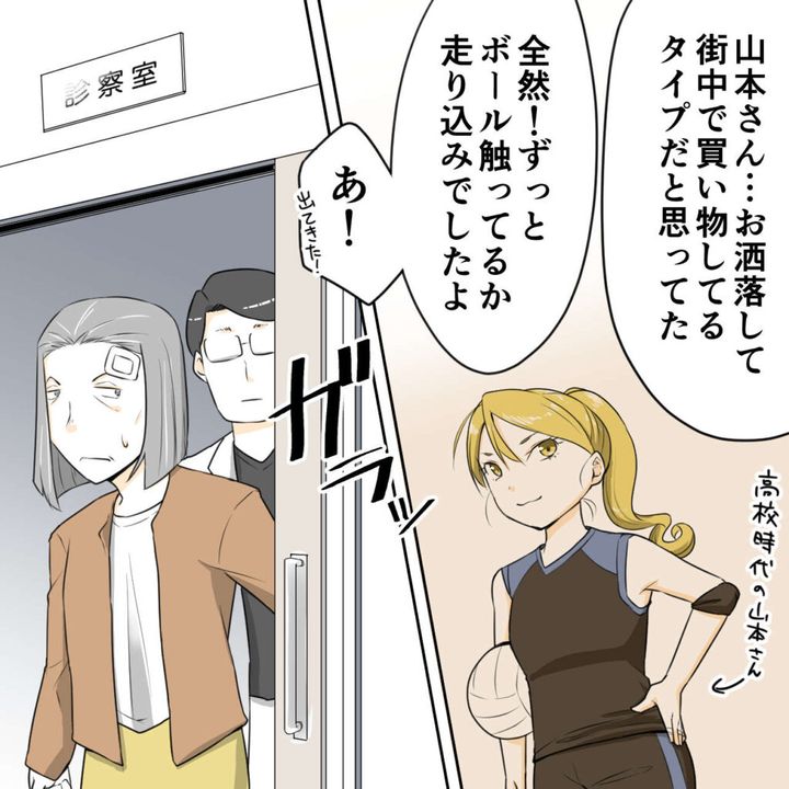「山本さん・・・お洒落して街中で買い物してるタイプだと思ってた」と言うと「全然!ずっとボール触ってるか走り込みでしたよ」と答えるケイコさん。その時、診察室のドアがガラッと開き、ケイコさんのお義母さんがばつの悪そうな表情で医師と一緒に出て来ました。