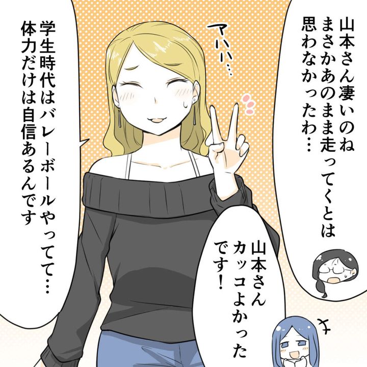 「山本さん凄いのね。まさかあのまま走ってくとは思わなかったわ・・・」と驚くミチコと「山本さんカッコよかったです!」と尊敬のまなざしを送る渡辺さん。ケイコさんは少し照れくさそうに笑いながら「学生時代はバレーボールやってて・・・体力だけは自信あるんです」とピースサイン。