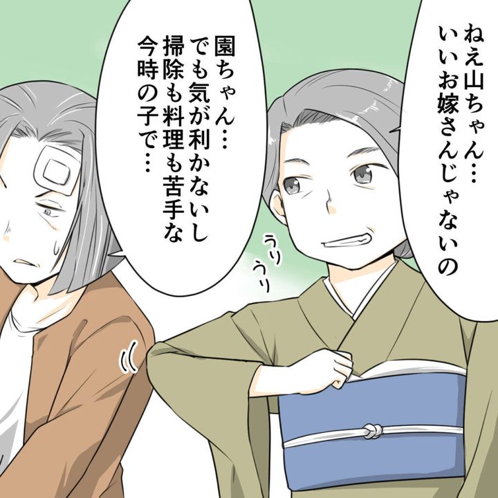 ここで母が「ねぇ山ちゃん・・・いいお嫁さんじゃないの」と肘でつつきながらこっそりケイコさんのお義母さんに声をかけると「園ちゃん・・・でも気が利かないし、掃除も料理も苦手な今時の子で・・・」とケイコさんの出来ない部分ばかりを言うお義母さん。