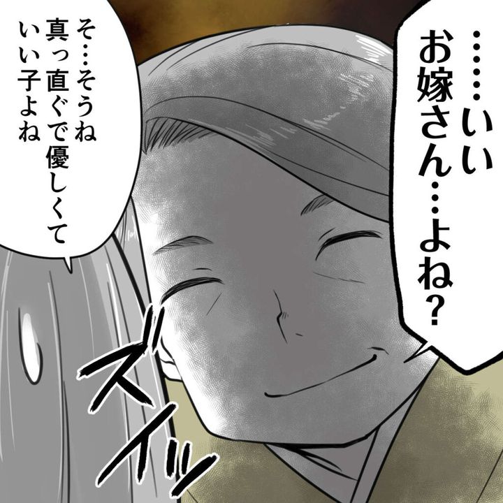 そんな素直じゃないお義母さんに母はズイッと顔を近づけ「・・・いいお嫁さん・・・よね?」とにっこり。母の圧にさすがのお義母さんも「そ・・・そうね。真っすぐで優しくていい子よね」とようやくケイコさんのことを褒めました。