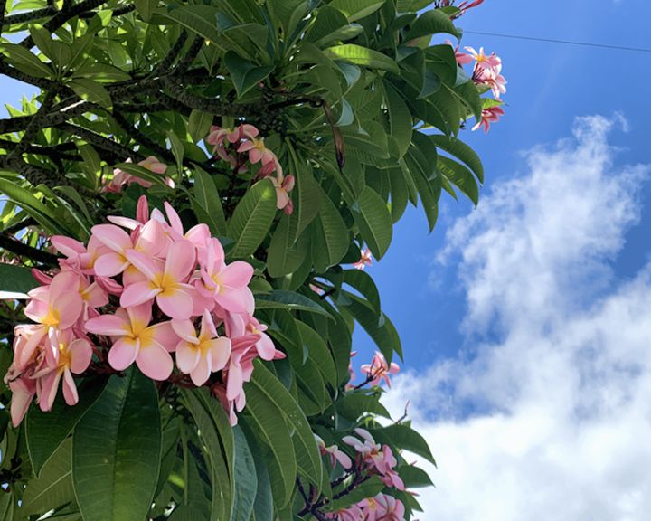 通学中、見上げれば青空とプルメリア。