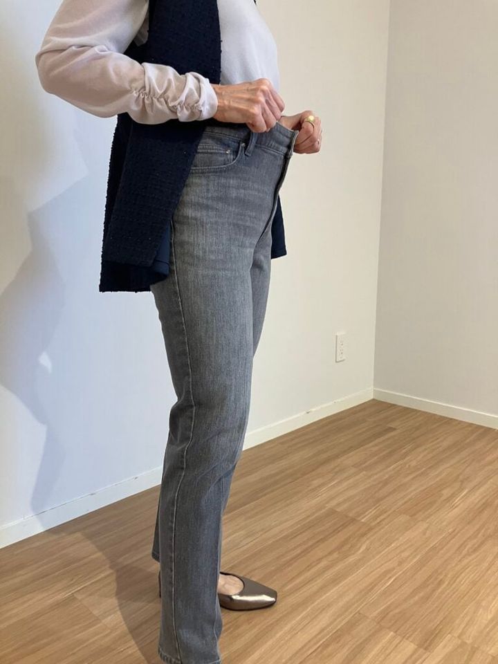 こちらは、PLUS STYLEハイライズワイドジーンズの色違いでNAVYを着用。淡いカラーよりも洗練された印象で、ジャケットスタイルにもぴったり。