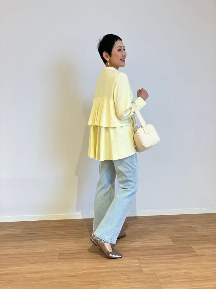 PLUS STYLEハイライズワイドジーンズ(BLUE)¥13,000、バックフリルバンドカラーシャツ¥8,990、ソフトショルダーバッグ¥8,990、スクエアトゥメリージェーン2WAYパンプス¥¥9,990/プラステ