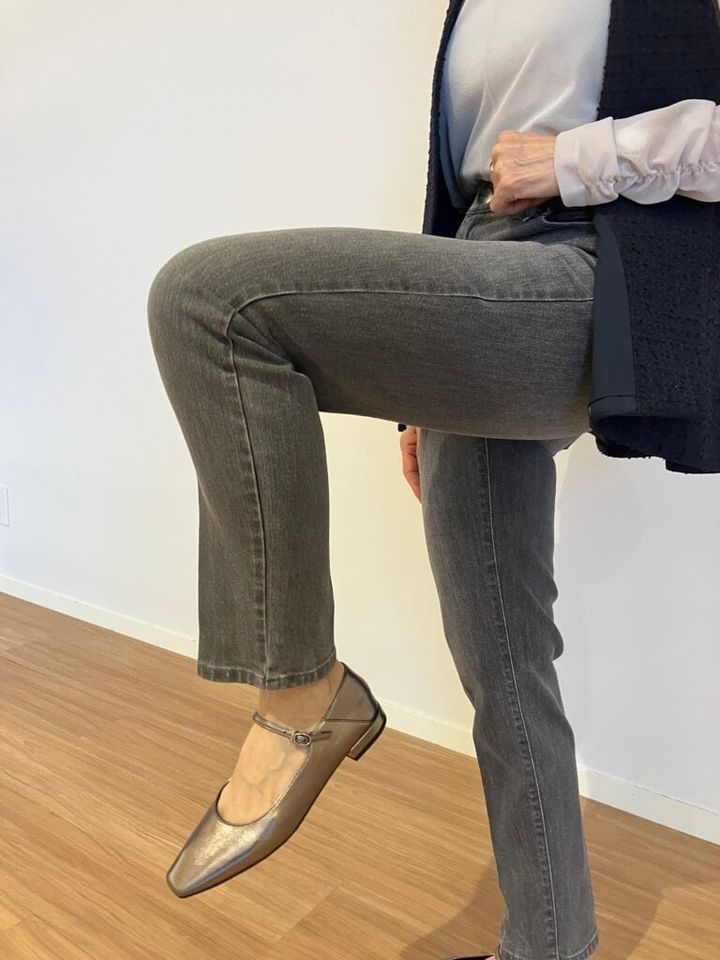 PLUS STYLEジーンズの中でも、すっきりとしたシルエットが特徴的なスティックタイプ。裾に向かって徐々に細くなるデザインと美脚を叶えてくれるセンターラインのおかげで、テーパードパンツをはいているかのようにきれいめに着こなせます。