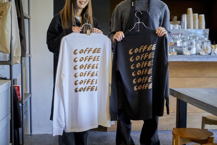 同じく山瀬まゆみさんが描くCOFFEEの文字が並ぶ「ロングTシャツ」8800円は、黒と白の2色。山瀬まゆみさんデザインのマグカップとTシャツは京都店でしか買えない限定品。ぜひ手に入れて、東京のお店に着ていきたいですね。