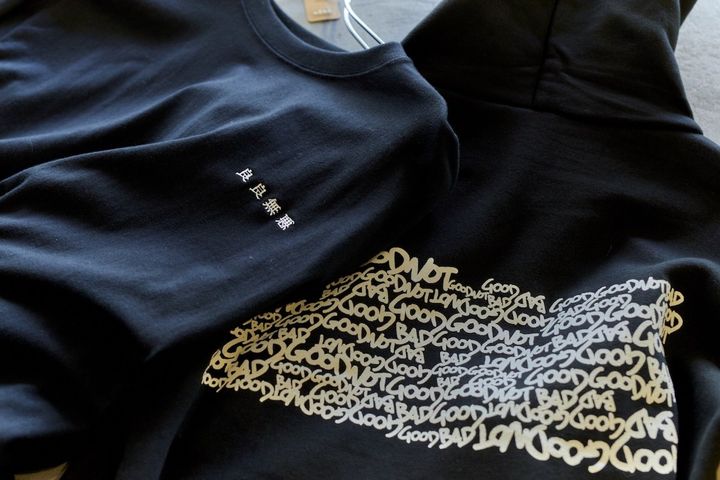 店名「Good good not bad」の由来となったのは、カナダのトロント出身の3人組、インストゥルメンタル・ジャズ・バンドの「BADBADNOTGOOD」。そのバンドメンバーが書いた文字を背面のデザインとして起用した「フーディー」1万2000円や「Good good not bad」を日本語訳した文字「良良無悪」の刺繍が入った、少しユーモアのある「ロングTシャツ」6500円もオリジナルグッズとして販売されています。