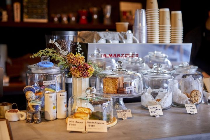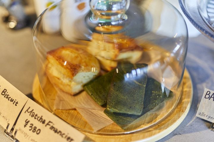 焼き菓子の後ろに置かれているのは、職人による手作業の技術を大切にするイタリアの老舗メーカー「ラ・マルゾッコ社」のエスプレッソマシン。コーヒーに関しては渋谷店でも提供されているコーヒースタンド「CAMELBACK」と同じものが使われており、京都店では、機材や豆、コーヒーのいれ方などのすべてを「CAMELBACK」の鈴木啓太郎さんが監修しているそう。