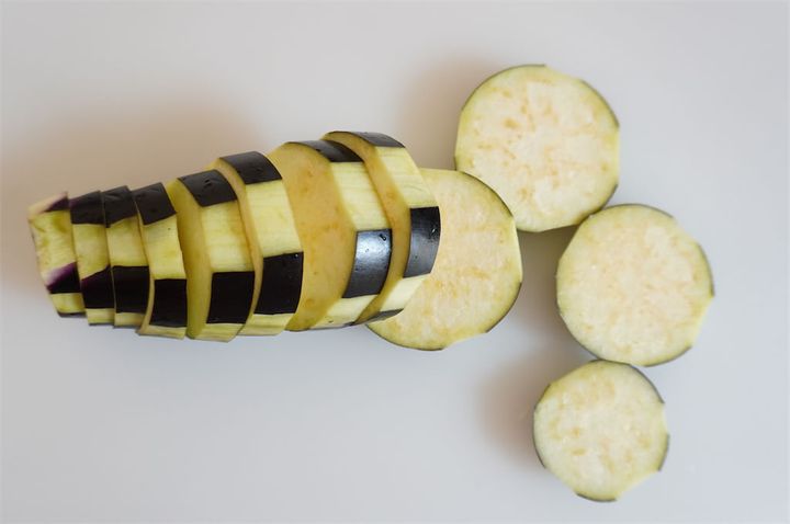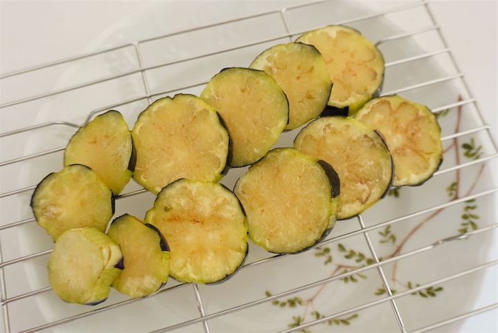 2.なすは皮をしましまに剥いて5mm幅の輪切りにし、180℃の油で素揚げする。