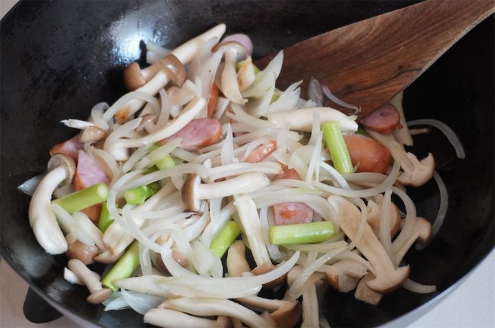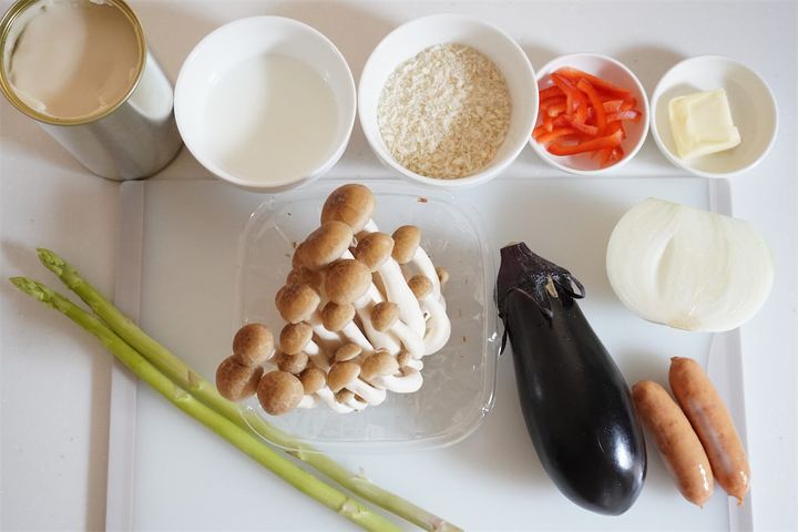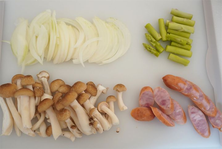 1.しめじは石づきを取ってほぐす。玉ねぎは薄切り、アスパラガスは3cm幅、ウインナーは斜めに切る。