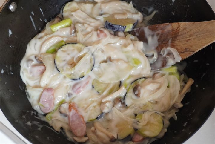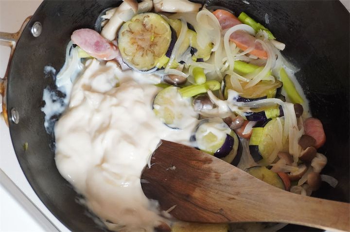 野菜を端に寄せ、空いたところにホワイトソースを加えて、牛乳でなめらかになるまでのばします。