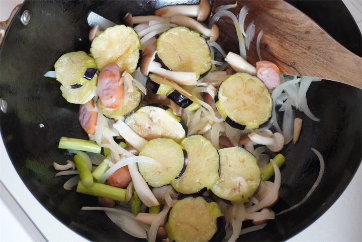 3.フライパンにサラダ油大さじ1(分量外)を熱して、1のしめじ、玉ねぎ、アスパラガス、ウインナーを炒める。全体がしんなりしてきたら2の素揚げしたなすを加えて軽く炒める。