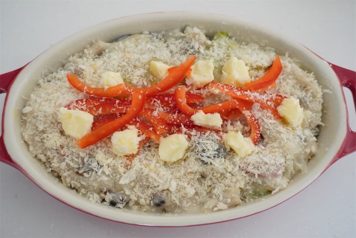 5.耐熱皿にサラダ油かバター(共に分量外)を薄く塗り、4を入れてパプリカ、パン粉、粉チーズ、バターの順に上にのせ、オーブントースターで5分焼く。