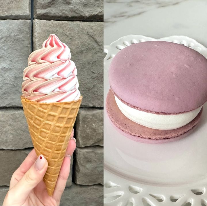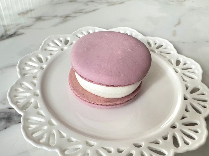 ブルーベリー風味のマカロンの中には、ホワイトショコラアイスとブルーベリーソースが入っています。