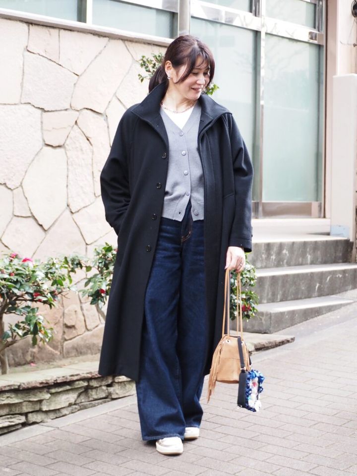 ロングコートをなびかせて颯爽と街を歩く園部さん。コートの下にはショート丈のカーディガンと「リーバイス」のデニムをチョイス。足元はスニーカーで抜け感を。「デニムは太めのシルエットが好みです。上半身をコンパクトにして下半身にボリュームを出してバランスを取るようにしています」