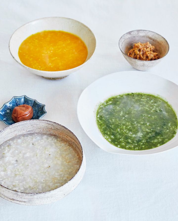 「年齢とともに食べられる量、食べたいものが変わり、体の声に耳を傾けていたら、おかゆの出番が増えました。ごはんが少なくてすみ、お野菜たっぷりなのでヘルシーですし、ビーツやほうれん草、かぼちゃのお粥は彩りも楽しめます」。