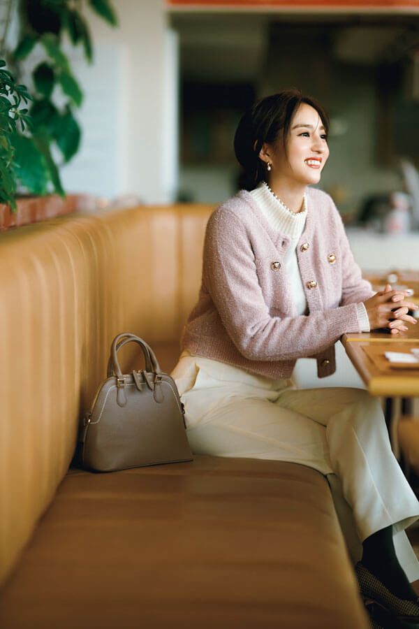 ジャケット感覚で羽織れるピンクの甘カーデは、マニッシュなパンツを合わせて新鮮な表情に。