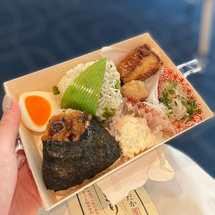 「高菜とじゃこのおにぎり」「うなぎとごぼうの炊込みおにぎり」の2種類のおにぎりに、食堂とだかの人気メニューである「白滝とザーサイのペペロンチーノ」、「いぶりがっこポテトサラダ」、「里芋唐揚げ 」、そして鶏の唐揚げ、ゆで卵が入っていてボリューム満点!!