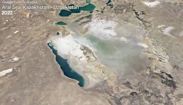 アラル海のタイムラプス。1984年~2022年 / Credit:Google Earth(YouTube)_Aral Sea, Kazakhstan – Uzbekistan – Earth Timelapse(2023)