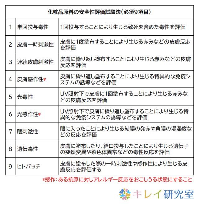 化粧品の原料は、日本化粧品工業連合会(粧工連)の策定した「化粧品安全性評価に関する指針(2015)」において定められた9つの必須項目によって、安全性が担保されています。