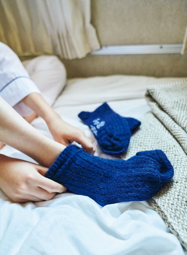 朝晩は特に冷え込む今の季節、足元をしっかりと温めて心地よく過ごしたい。手に取ったのは、1893年から続くイギリス・サウスウェールズのニットメーカー、〈コーギー〉のリブソックス。現地の職人によってモヘア素材をふっくらと編み上げた生地は、空気をたっぷり含んで保温性は抜群。つま先部分はハンドキリングで仕上げていて、指先まで柔らかくフィットする。英国ロイヤルワラントに選ばれているのも納得の一足。¥6,930(ザテイストメイカーズ アンド コー 03‒5466‒6656) パジャマは2で紹介。その他スタイリスト私物