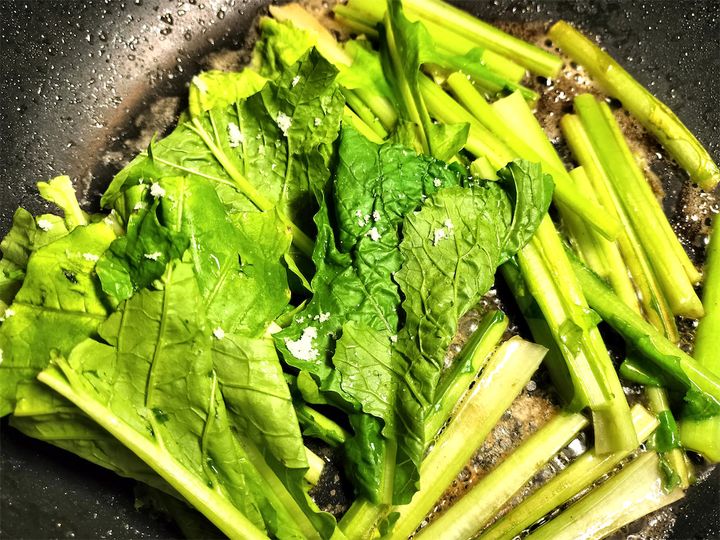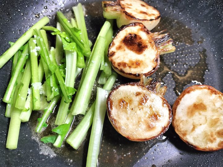 6. 5のかぶを取り出し、葉を入れてさっと炒めて取り出します。