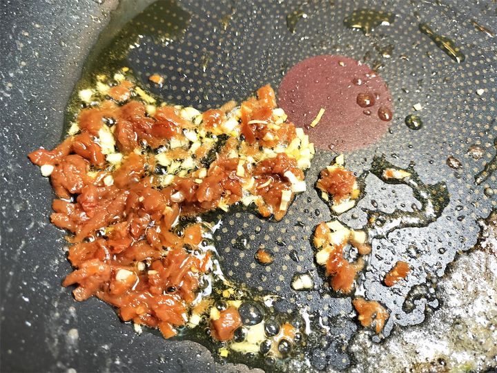 8. 中火にかけ、にんにくに火が入る前に梅干しを加えます。