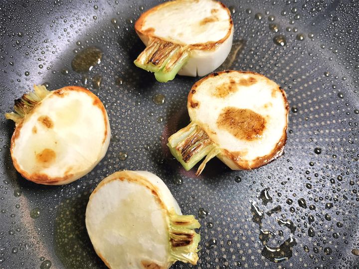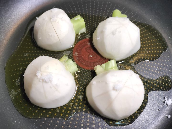 2. かぶを半分に切ってから丸い部分に隠し包丁を入れます。そのままオリーブオイルを引いたフライパンに並べ、中火にかけて塩を振ります。