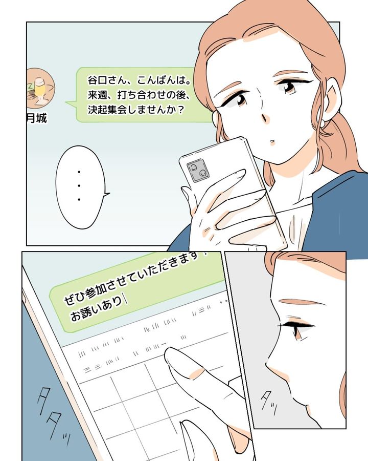 「谷口さん、こんばんは。来週、打ち合わせの後、決起集会しませんか?」というメッセージを見て、「・・・」少し考えた後、「ぜひ参加させていただきます。お誘いありがとうございます」と返信しました。