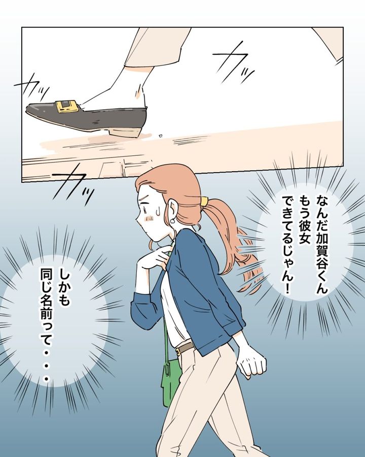 加賀谷くんと同級生の彼女ユリちゃん(同じ名前!)その他大学の友達グループのいた場所から離れ、家へと急いで歩く私。「なんだ加賀谷くん、もう彼女できてるじゃん!しかも同じ名前って・・」と複雑な心境に。