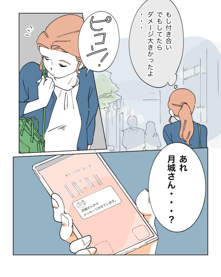 「もし付き合いでもしてたらダメージ大きかったよ・・」と呟いていると、ピコン!とスマホが。「あれ月城さん・・?」取引先の月城さんからメッセージが届いたのでした。