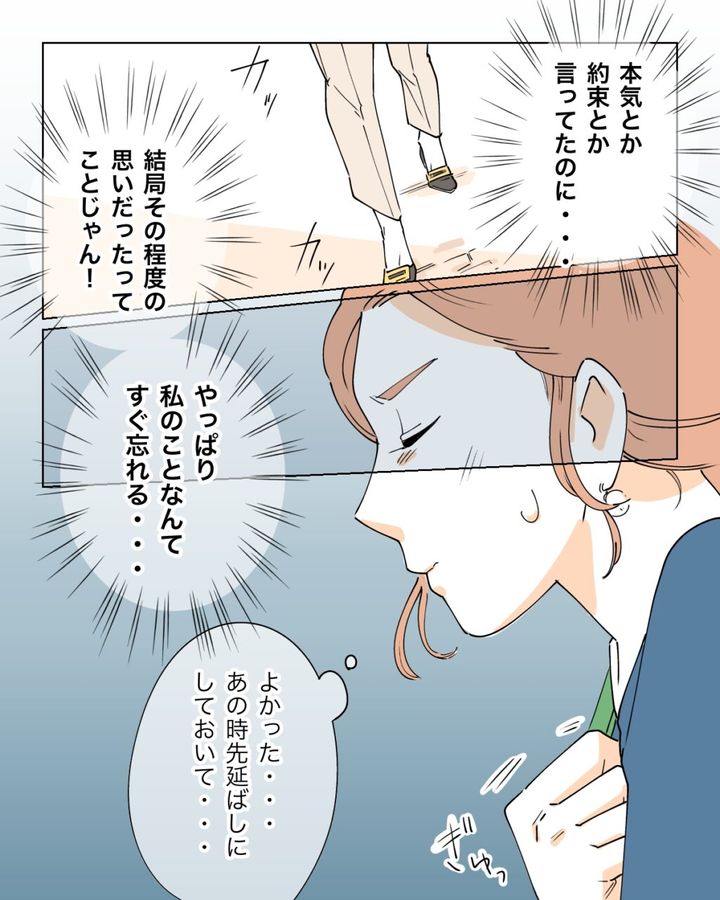 「『本気』とか『約束』とか言ってたのに・・結局その程度の思いだったってことじゃん!」「やっぱり私のことなんてすぐ忘れる・・」そう思いながら、「よかった・・あの時先延ばしにしておいて・・」と惨めな状況にならなかったことを良しとする私。