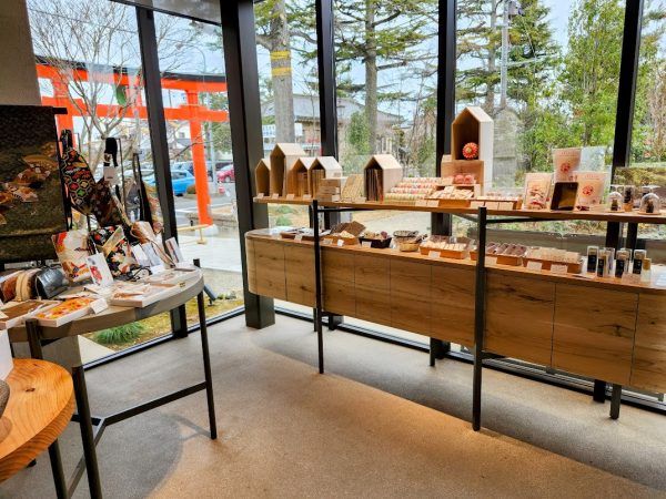 神社の神聖な雰囲気に溶け込むモダンな空間で、店内の大きな窓から差し込むやわらかい太陽の光も心地よく感じられます。