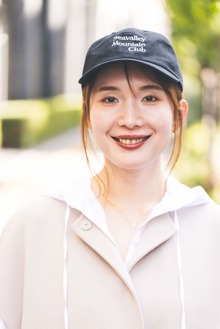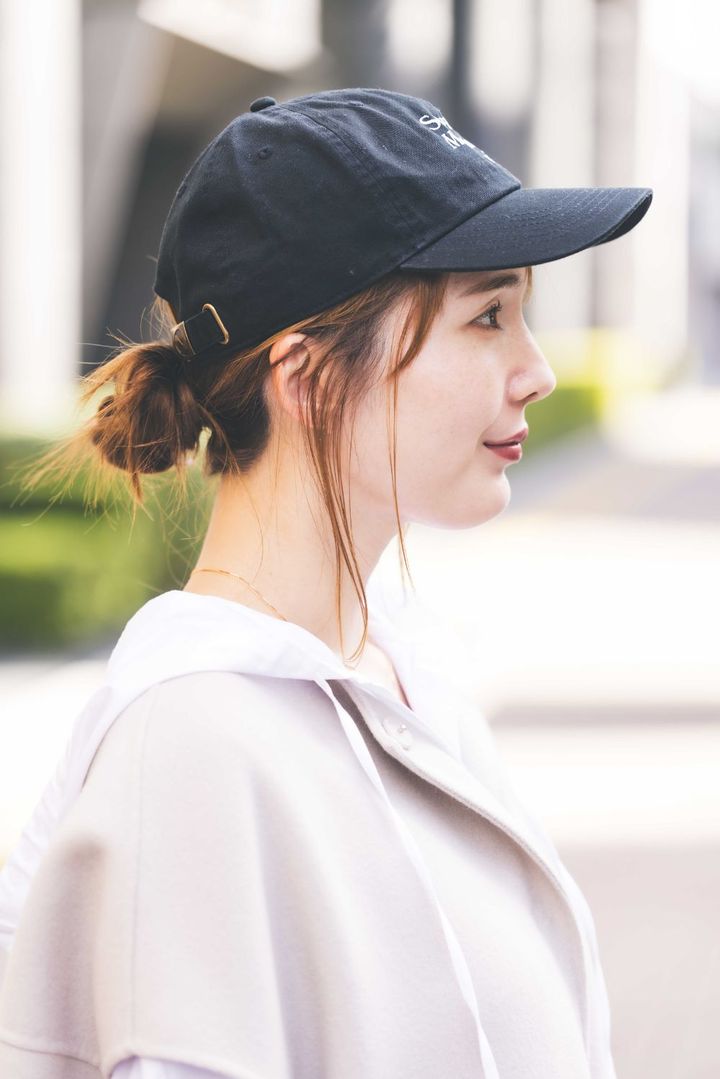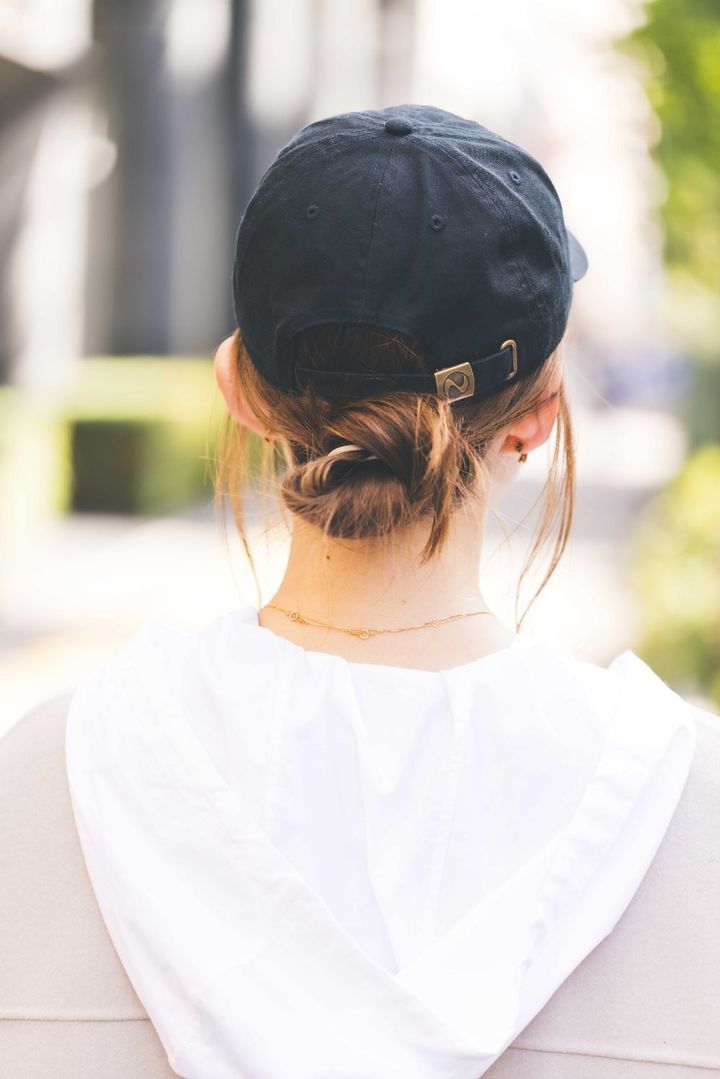「作り方は簡単で、一つ結びの最後、毛先を抜かないようにしてお団子を作って、ゴムを隠すように毛先で巻いていくだけ。多少髪が落ちてもそのほうがオシャレに見えるので気にしていません。キャップを被るときは斜め下向きに作ると、深く被っても崩れにくくなるのおすすめです。お出かけ用のアレンジにするときは先にシンピュルテのヘアオイルを塗ってツヤが出るようにしています」安永かおりさん・35歳(164㎝/4歳と3歳の女の子ママ)