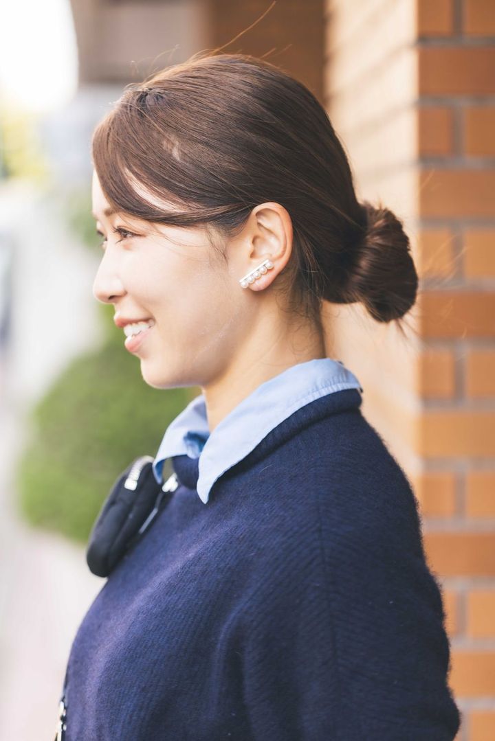 「顔まわりをすっきり見せたいときや、抜け感がほしいときによくするお団子ヘア。ワックスを髪全体に馴染ませて低い位置でまとめ、最後結ぶときに毛先を抜かずにお団子を作ります。毛先はゴムに巻きつけてピンで固定しています。簡単なアレンジですが、ピタッとするところとふんわりさせるところのメリハリをつけて、後れ毛は慎重に調整してオシャレに見えるようにしています」開坂沙耶さん・31歳(158cm/7カ月の男の子ママ)