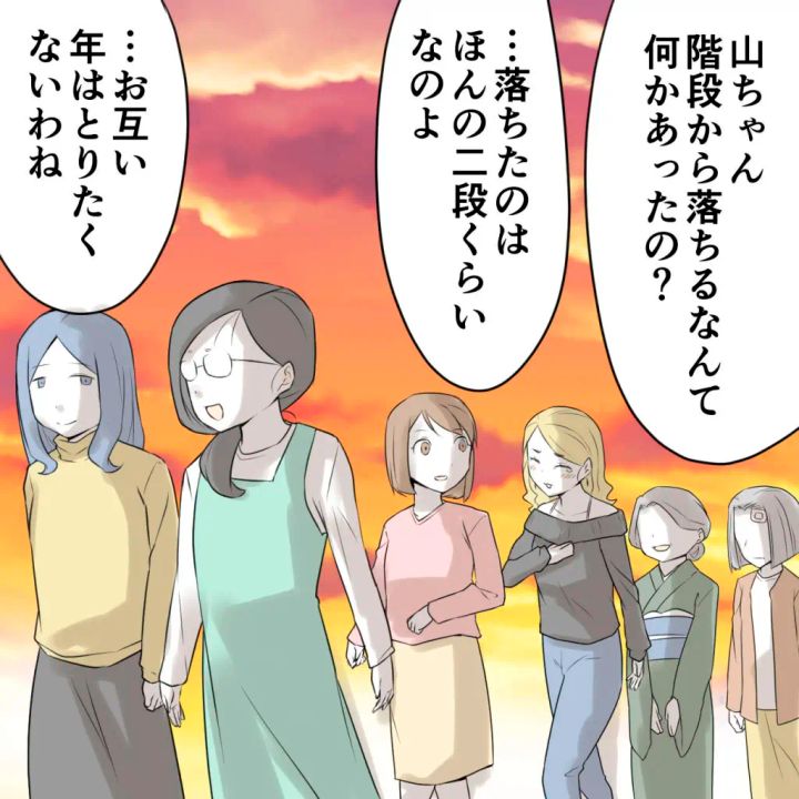病院からの帰り道、母がケイコさんのお義母さんにケガの経緯を聞いてみると、サワコさんは階段を2段ほど踏み外してしまったようでした。「お互い年はとりたくないわね」と笑う母に、サワコさんも「嫌だわ」と、踏み外した時のことを詳しく話してくれました。
