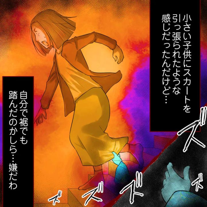 サワコさんによると、階段を下りていた時に小さい子どもにスカートを引っ張られたような感じがしたのだそうです。自分で裾でも踏んだのかしら、と言うサワコさん。