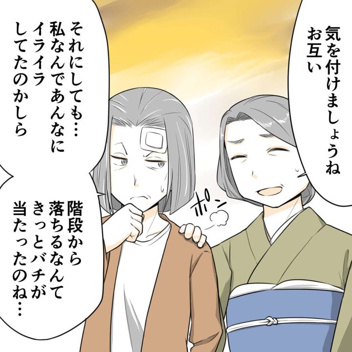 憑き物が落ちたかのように、サワコさんはイライラしていた自分のことが不思議そうで「階段から落ちるなんてきっとバチが当たったのね」と言っていました。そんなサワコさんの肩をポンと叩き「気をつけましょうね、お互い」と笑顔の母でしたが。