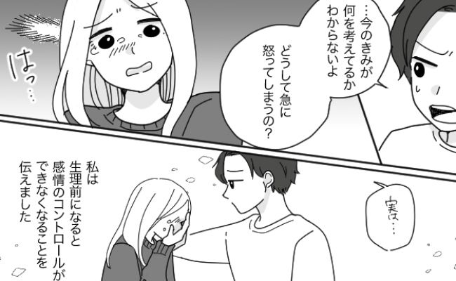 それて結婚してからの生理前。夫に冷たい態度を取ってしまった際に、夫から「きみが何を考えているのかわからない」と言われました。いつもは私のことを気づかってくれていた夫でしたが、我慢の限界がきたのでしょう。「どうして急に怒ったり泣いたりするの?」と聞かれ、私も溜まっていたものがあふれてしまいました。